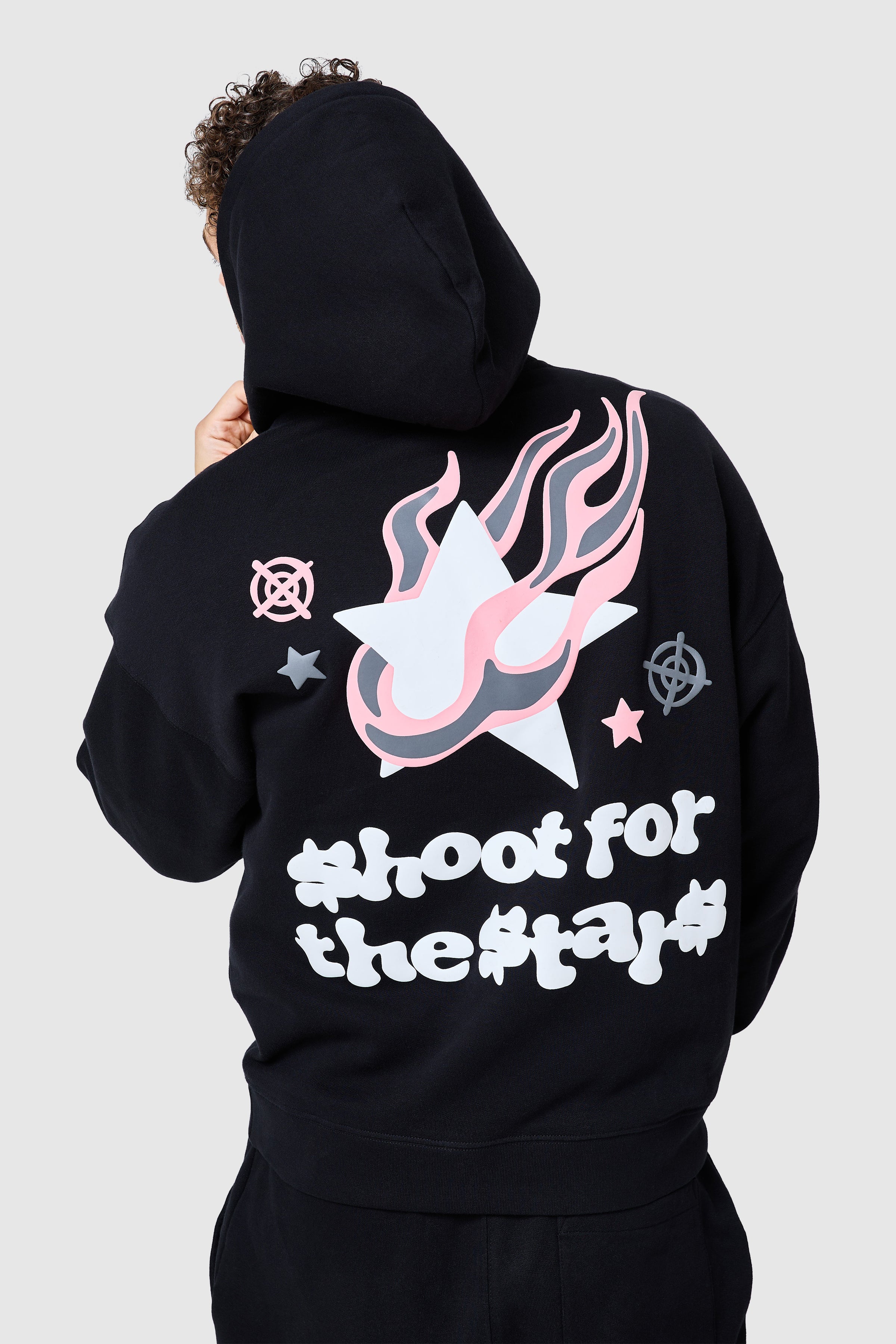 Introducing the Shoot For The Stars Hood. Featuring a bold graphic puff print and ribbed cuffs and hem, it pairs perfectly with the matching fleece jogger for a complete look.
